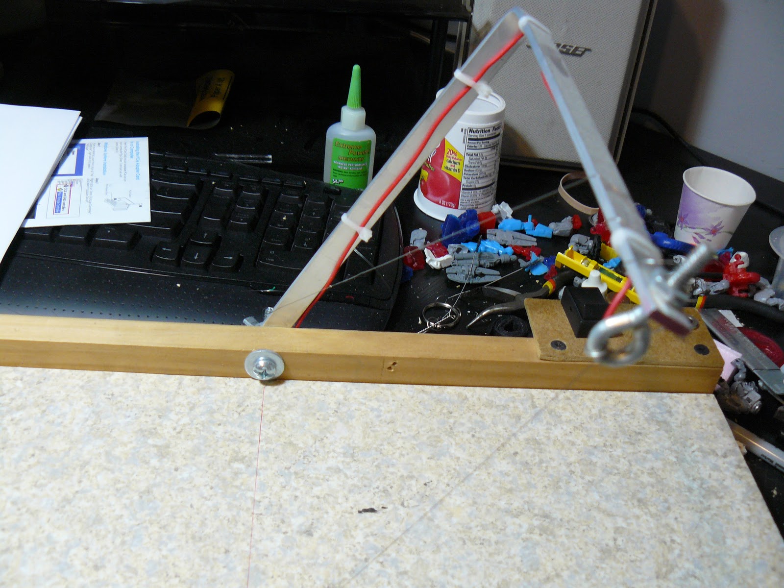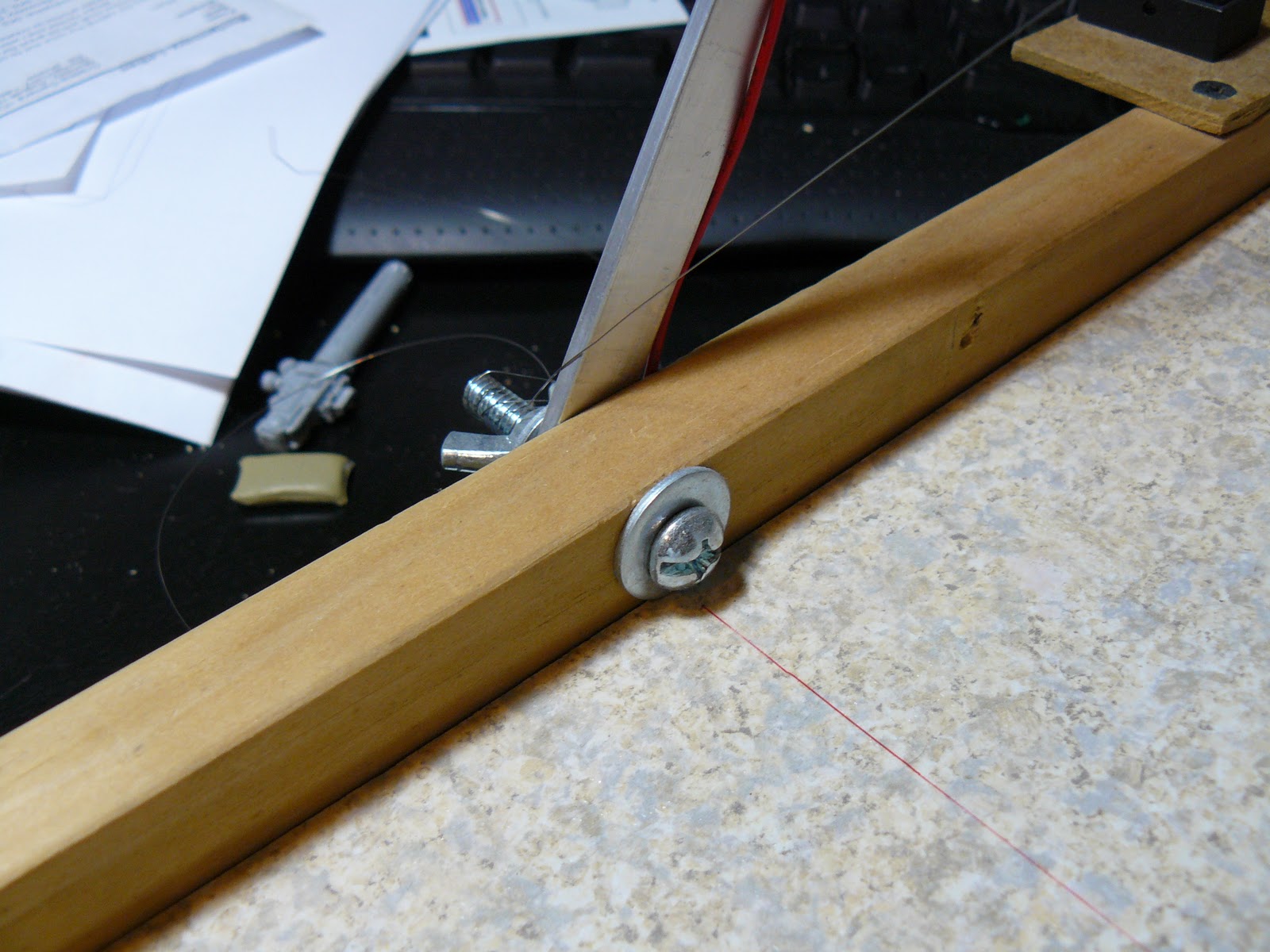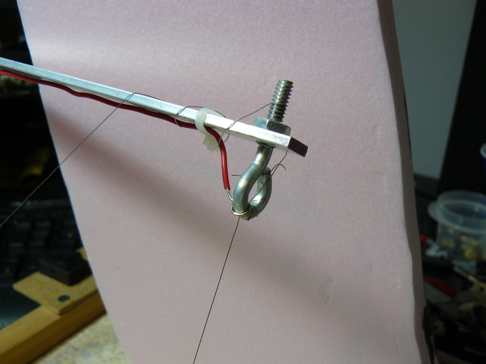 Затем я согнул алюминиевую полосу под прямым углом и закрепил её к основанию с помощью болта и гайки-барашка. Таким образом обеспечивается возможность резки пенопласта под углом. Провод закрепил к полосе обычными стяжками. Нихромовая нить, как сверху, так и снизу крепится к болтам с круглым крючком.