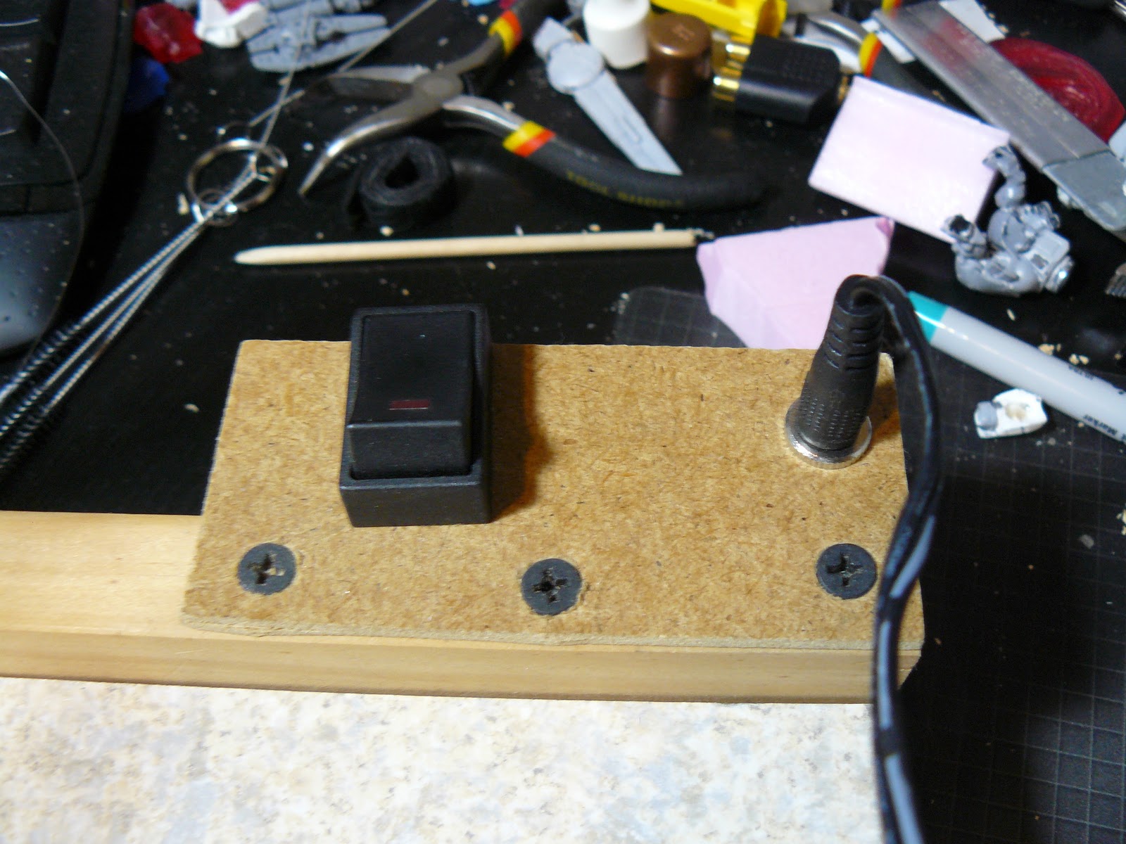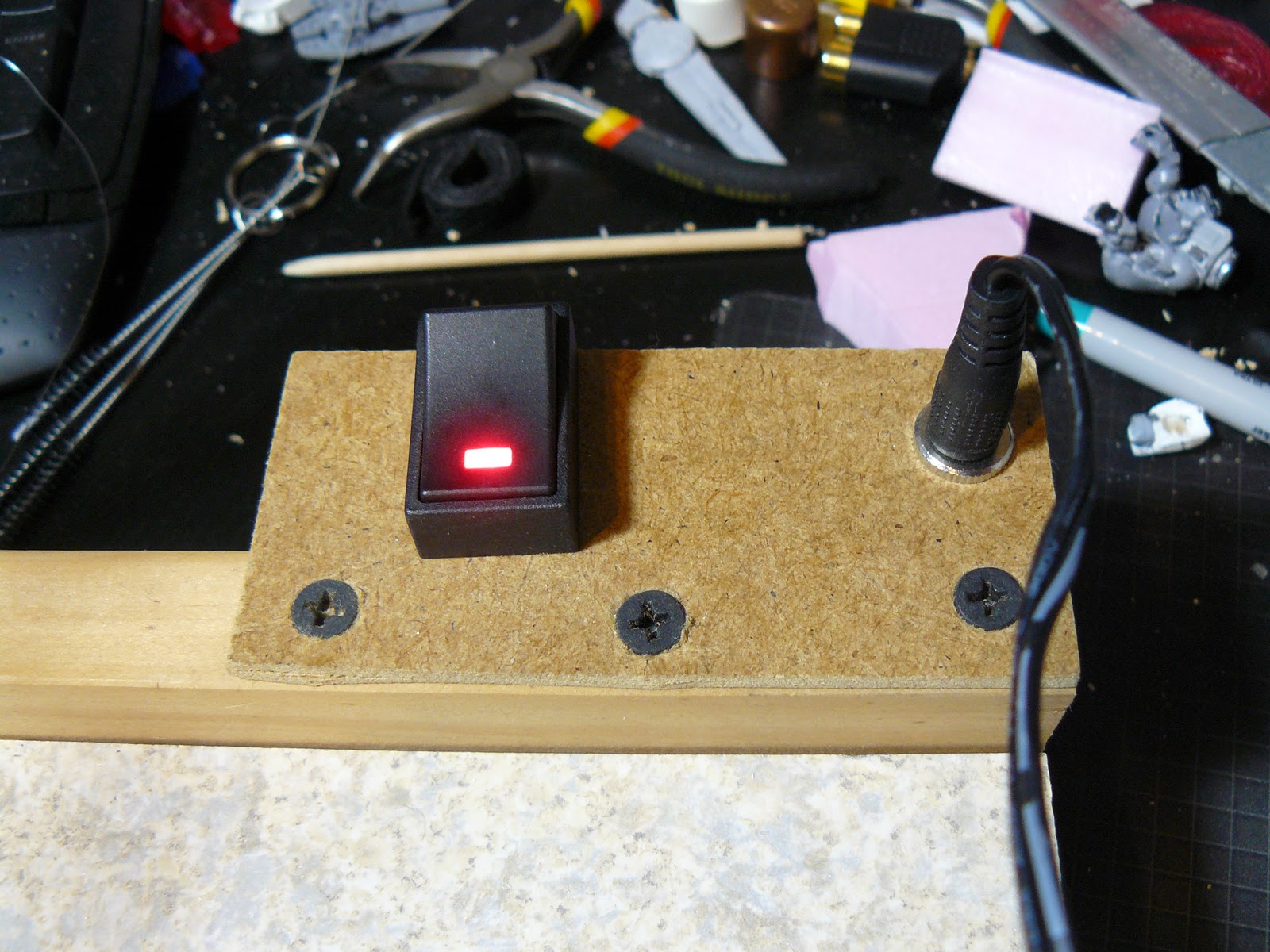 В роли режущего инструменты выступает нихромовая проволока, которая нагревается, при прохождении через неё электрического тока. Блок питания 12 Вольт, 1,3 Ампера я взял готовый, от старого автоответчика. Длина нихромовой проволоки — около 15 сантиметров. Выключатель был уже с встроенной лампочкой, которая светилась при включении, но если у Вас такого нет, на схеме же я показал как подключить обычный светодиод, который показывал бы состояние (включено / выключено).