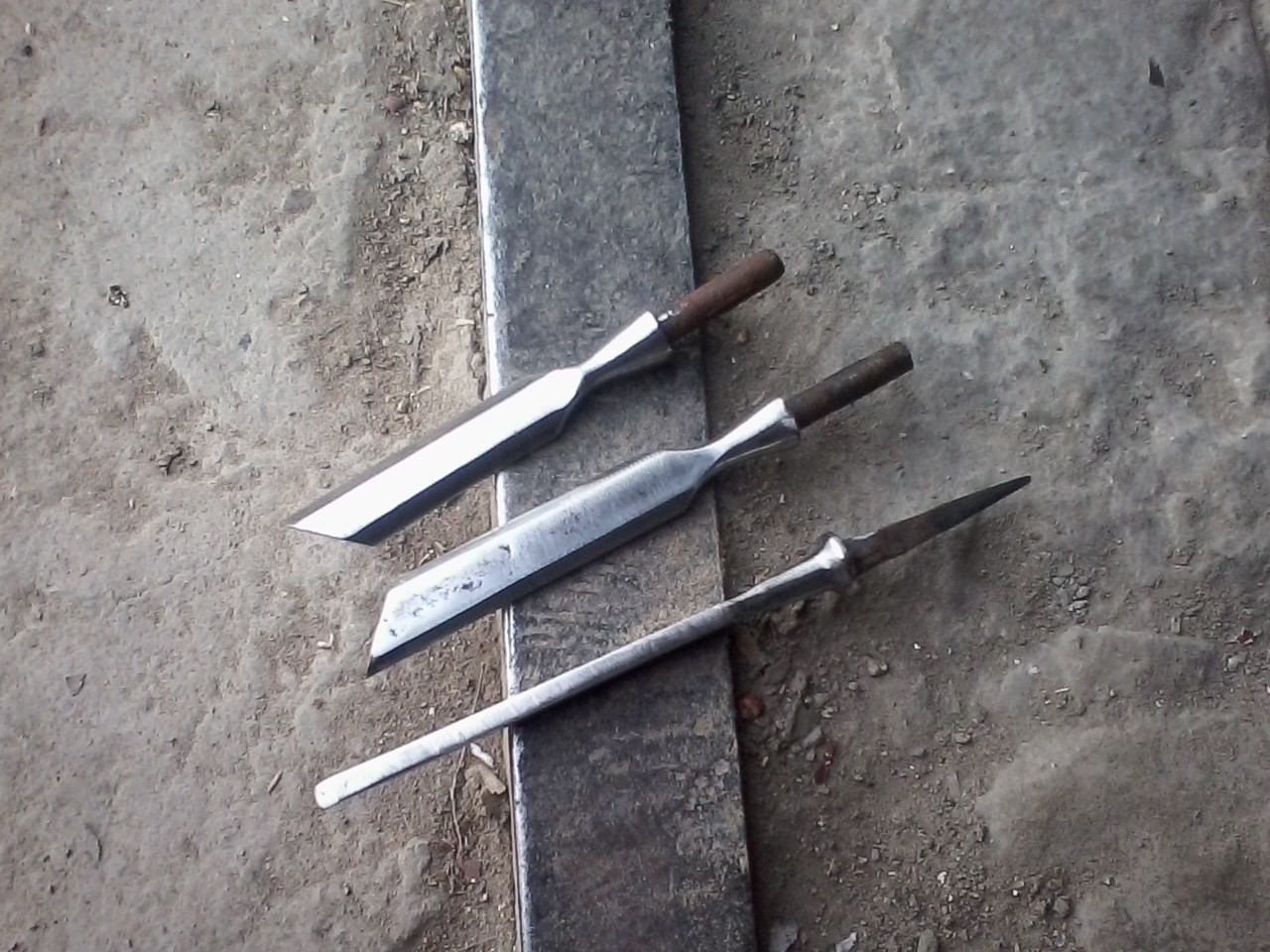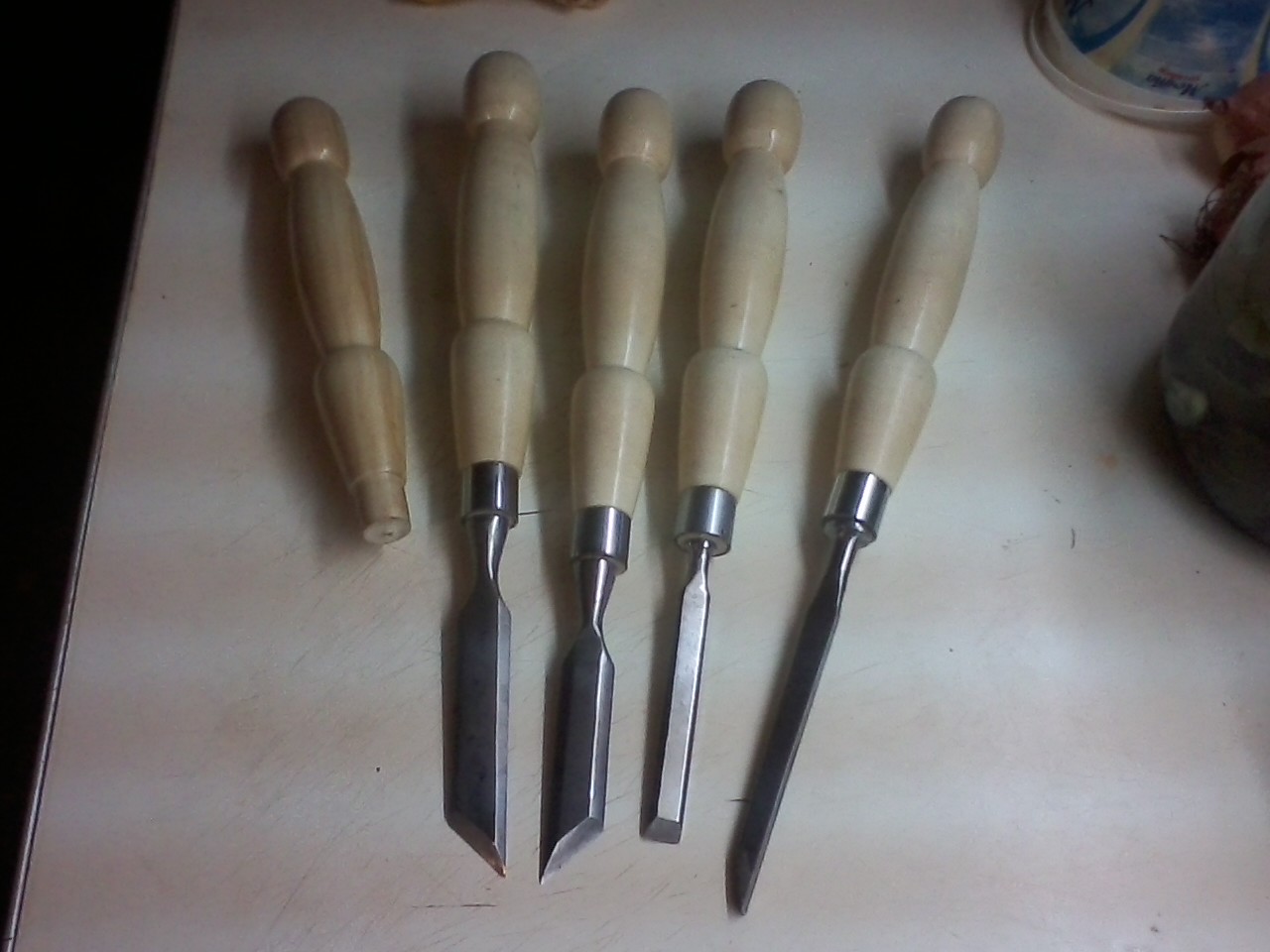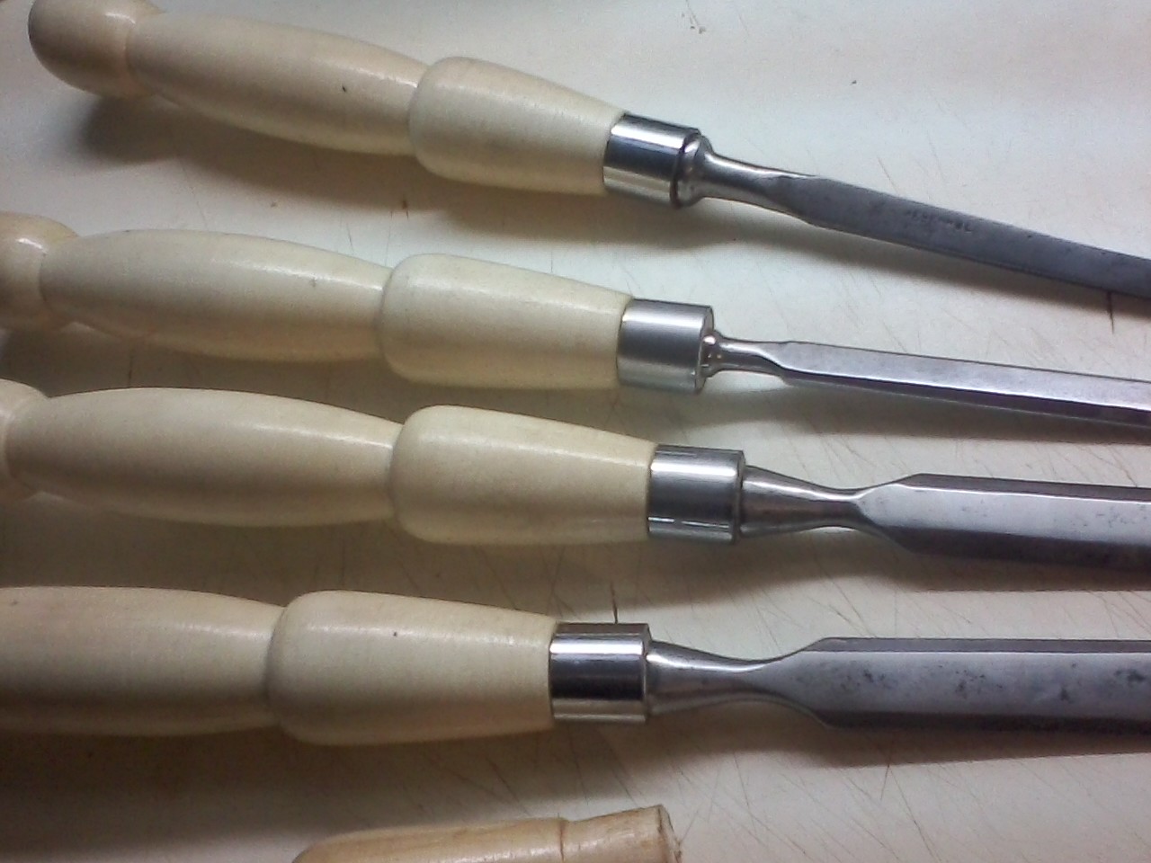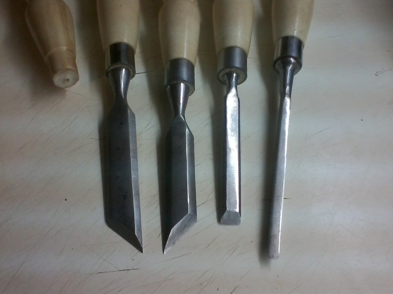 Собрал я токарный станок и появилось у меня проблема нет инструмента для него ,купил черенок для лопаты из берёзы из них я выточил ручки для стамесок ,нарезал кольца их старого руля велосипедного ,взял несколько старых советских стамесок придал им форму шлифанул и натёр пастай Гое получились как новые, ещё нужно найти мне стамеску полу круглую может кто то подскажет из чего можно сделать?