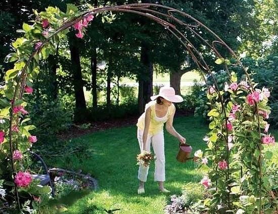 Одной из самых популярных подобных конструкций является арка — дугообразная постройка на двух опорах. Несмотря на высочайшие декоративные качества, конструкция ее очень проста, поэтому арка для цветов на даче может быть выполнена своими руками.