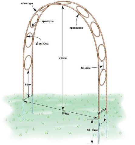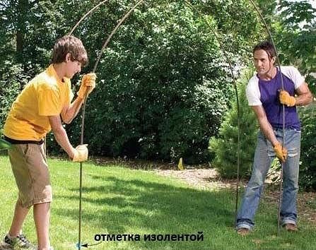 2. В этой модели арки для соединения арматурных секций применяются металлические кольца. Их изготавливают из более тонкой, чем основные секции, арматуры d=6 мм. Из связки арматуры нарезают 9 кусков по 94 см и формируют из них кольца с помощью трубогиба. В том случае, если этого инструмента у вас нет, конструкцию арки можно упростить и вместо колец соединить дугообразные секции прямыми прутами. Выглядеть такая арка будет проще оригинального варианта, но и она будет вполне функциональной.3. Согнутые основные секции арки устанавливают в грунт, углубляя арматуру на 40-45 см. 4. На расстоянии 61 см от низа арки мягкой проволокой привязывают металлические кольца, соблюдая между ними расстояние в 15-20 см. Они позволят соединить воедино дугообразные секции и зафиксировать форму арки. 5. Для защиты арки от коррозии все металлические части изделия покрывают грунтовкой, а затем слоем масляной краски.