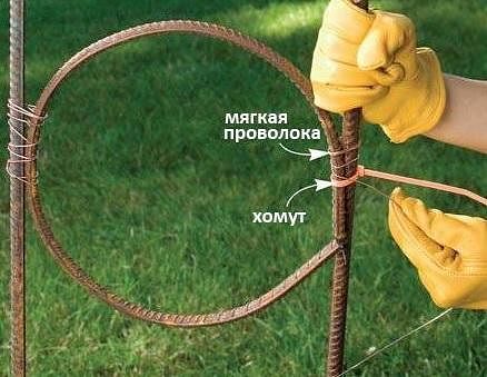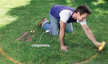 . Пошаговая схема изготовления: 1. Первым делом потребуется изогнуть куски арматуры d=10 мм для получения арочного проема. Для этого можно воспользоваться простым шаблоном из штырей длиной 0,25 м, вбитых в землю по рассчитанному контуру арки. Контур рисуют прямо на земле следующим образом: в землю вбивают стержень, к нему привязывают веревку L=0,9 м и, взяв свободный конец в руку, краской или мелом очерчивают полукруг. После чего, начиная с верхней точки полукруга, вгоняют в землю штыри. Полученным шаблоном пользоваться очень легко. Для того, чтобы придать арке дугообразную форму, арматуру d=10 мм огибают вокруг вбитых штырей. Изгиб будет более плавным, если между колышками и арматурой уложить прочный, но гибкий материал. Подойдет полоска сайдинга, планка ДСП и т.п.