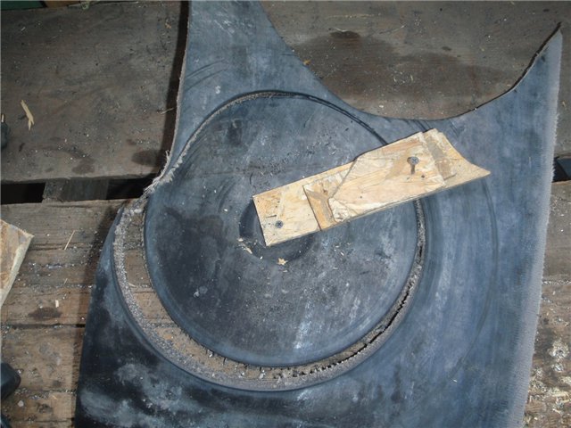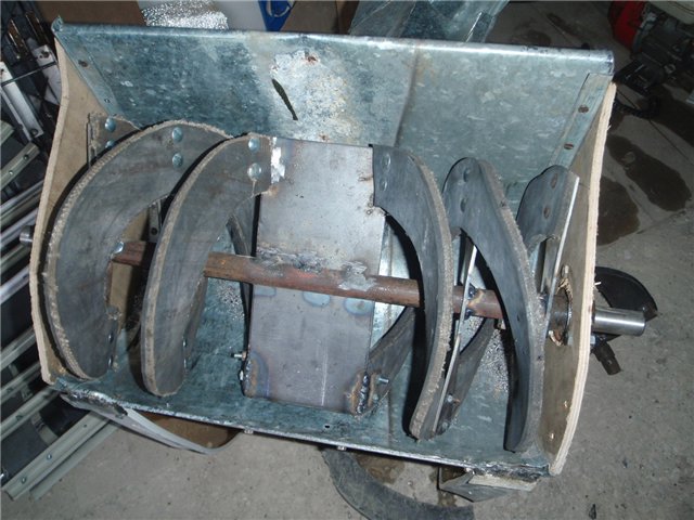 Первый вариант снегоуборщика, со шнеком из боковины авто покрышки нормально работал, что видно на видео ролике в начале этой темы, но мне показалось что он слишком много снега откидывает впереди себя, на качество уборки это конечно не сказывается, но как всегда хочется большего, и я решил переделать шнек, чтобы больше снега он сдвигал к откидывающей лопатке и сделать поворотный желоб, для регулировки направления и дальности отброса снега.