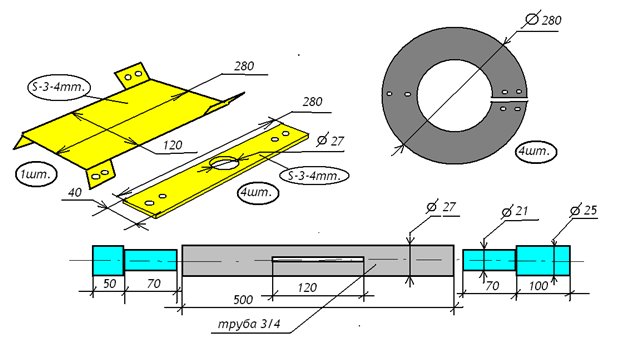 Опыта строительства простеньких снегоуборщиков у меня не большой, возможность использования станочного парка, для выполнения сложных работ, вообще нет, все делаю, как говориться из «ГО-НА» и на «КОЛЕНКЕ» в своем деревенском сарае, но иногда приходиться обращаться к токарю для изготовления не сложных деталей. Точных чертежей делать смысла тоже нет, последователи, кто соберется сделать для себя подобного помощника будет исходить из своих возможностей, все копировать тут наверно не надо, я думаю, что многим будет понятно, как я делал по фотографиям и рисункам.