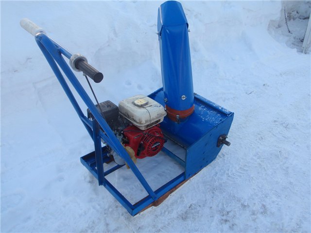 Решил остановиться на таком принципе работы снегоуборщика. Для уборки снега колеса ему как я понял особо и не нужны, если только катать по сараю, сделал вместо них лыжи, наклоняя снегоуборщик вперед можно подчищать снег с дорожек, а при наклоне назад можно откидывать снег поэтапно, если величина снежного покрова будет большая. В перспективе (в будущем) можно сделать снегоуборщик самоходным на одной широкой гусеницы при этом особо ничего не переделывая.
