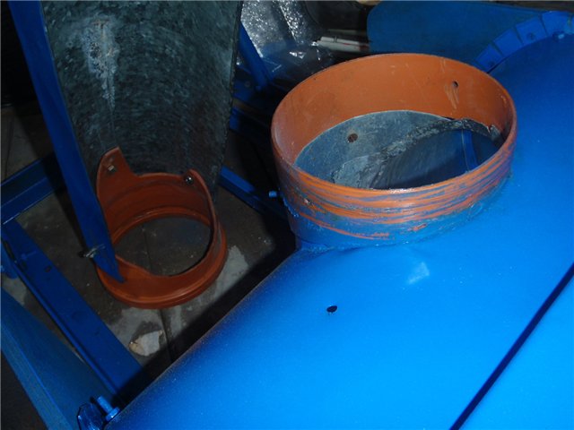 Канализационная труба 160мм. к ней крепиться желоб для выброса снега, а она в свою очередь одевается на такую же трубу закрепленную на корпусе шнека.