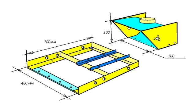 Корпус шнека я сделал из кровельного железа, боковины из 10мм. фанеры, его размер на 2 см., больше шнека, чтобы шнек не задевал за корпус и в тоже время зазор между корпусом и шнеком был не большой. Так как я использую свой двигатель для различных зимних покатушек, крепление двигателя сделано быстросъемным, что позволяет переставлять двигатель с одной техники на другую буквально за несколько минут без использования инструмента. К тому же при снятом двигателе снегоуборщик легче очистить от снега, и убирать в сарай, особо не напрягаясь, так как основной вес в снегоуборщике это двигатель.
