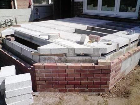 В качестве основного материала можете использовать дерево, кирпич, блоки из ракушника и т.д., главное, чтобы постройка гармонично сочеталась с архитектурным стилем дачного домика. В этом проекте я показала строительство веранды, которая представляет собой застекленные передние и боковые стенки, в одну из которых врезана входная дверь. В летнее время — это будет идеальное место для проведения досуга, а в зимнее – послужит в качестве кладовки для хранения леек, шезлонгов, контейнеров, шланг и емкостей для полива, а так же других садовых инструментов. Для начала определяемся с размерами веранды, делаем разметку профильными досками или нитями и закладываем фундамент. Глубина фундамента должна быть одинакова, чтобы в зимнее время не произошло отрыва веранды от основного домика из-за перепада нагрузки на грунт, а так же деформации строений. Выкопайте яму необходимого размера. Затем с помощью шпилек или дощечек отметьте уровень заливаемого в яму бетона. Сделайте смесь из бетона и вылейте ее в яму до запланированной отметки. Как правило, глубина должна быть от 300 мм и выше. Когда бетон застынет, сделайте основу из блоков. Причем внутренний их ряд должен быть до уровня высоты площадки. Рекомендую накрыть выложенные блоки полиэтиленовой пленкой. Таким образом, предотвратите прорастание растений. Затем из блоков и балок сделайте пол и залейте его бетоном. Уровнемером проверьте, чтобы поверхность была ровной, а также обратите внимание, чтобы в полу не было дыр и щелей. Очень важно, чтобы основа веранды была правильно сделана и выглядела как ровная и единая поверхность. Пол готов! Теперь займитесь возведением верхней части: стен, установкой окон и входной двери. Если у Вас нет опыта, то желательно пригласить специалистов или прочитать соответствующую литературу.