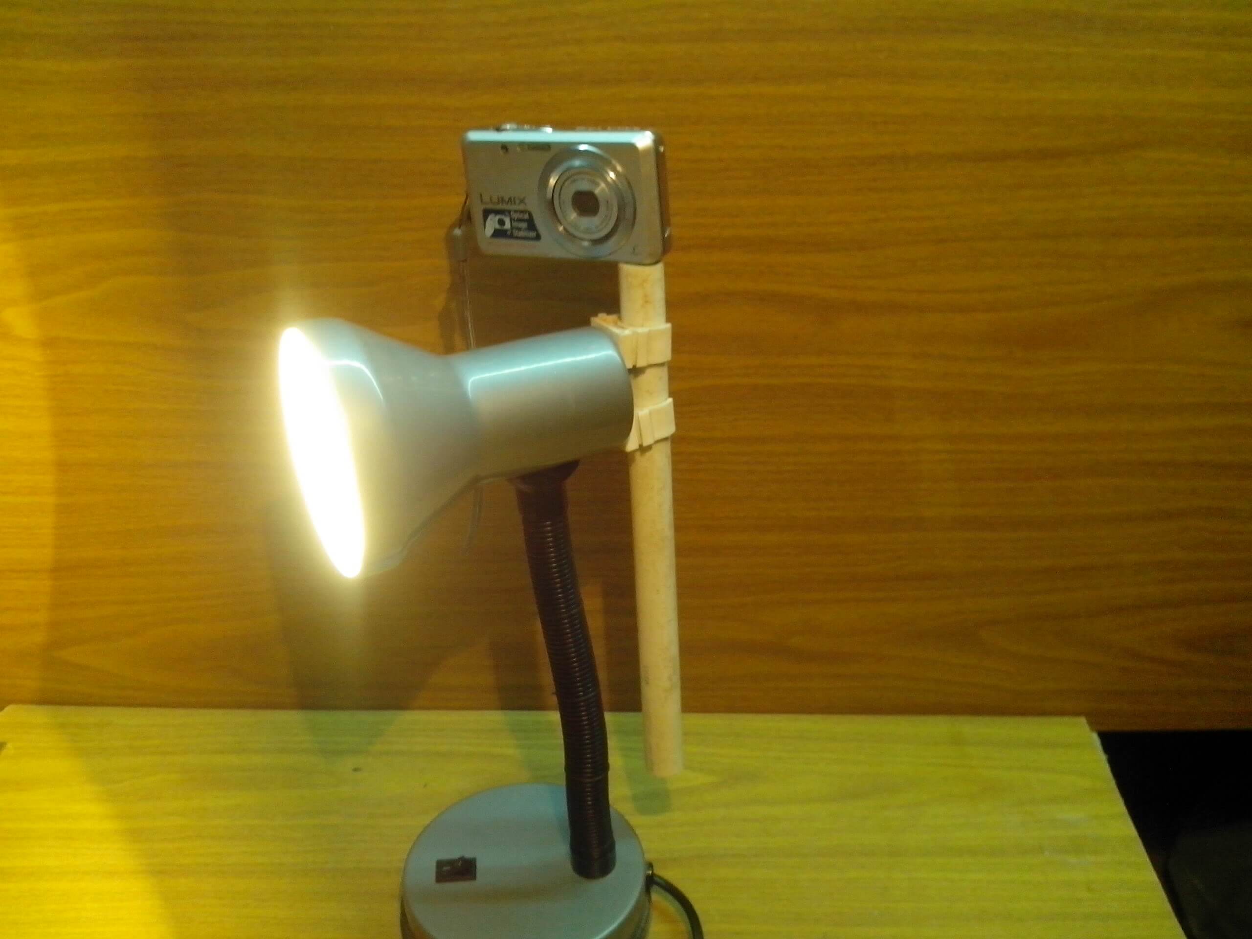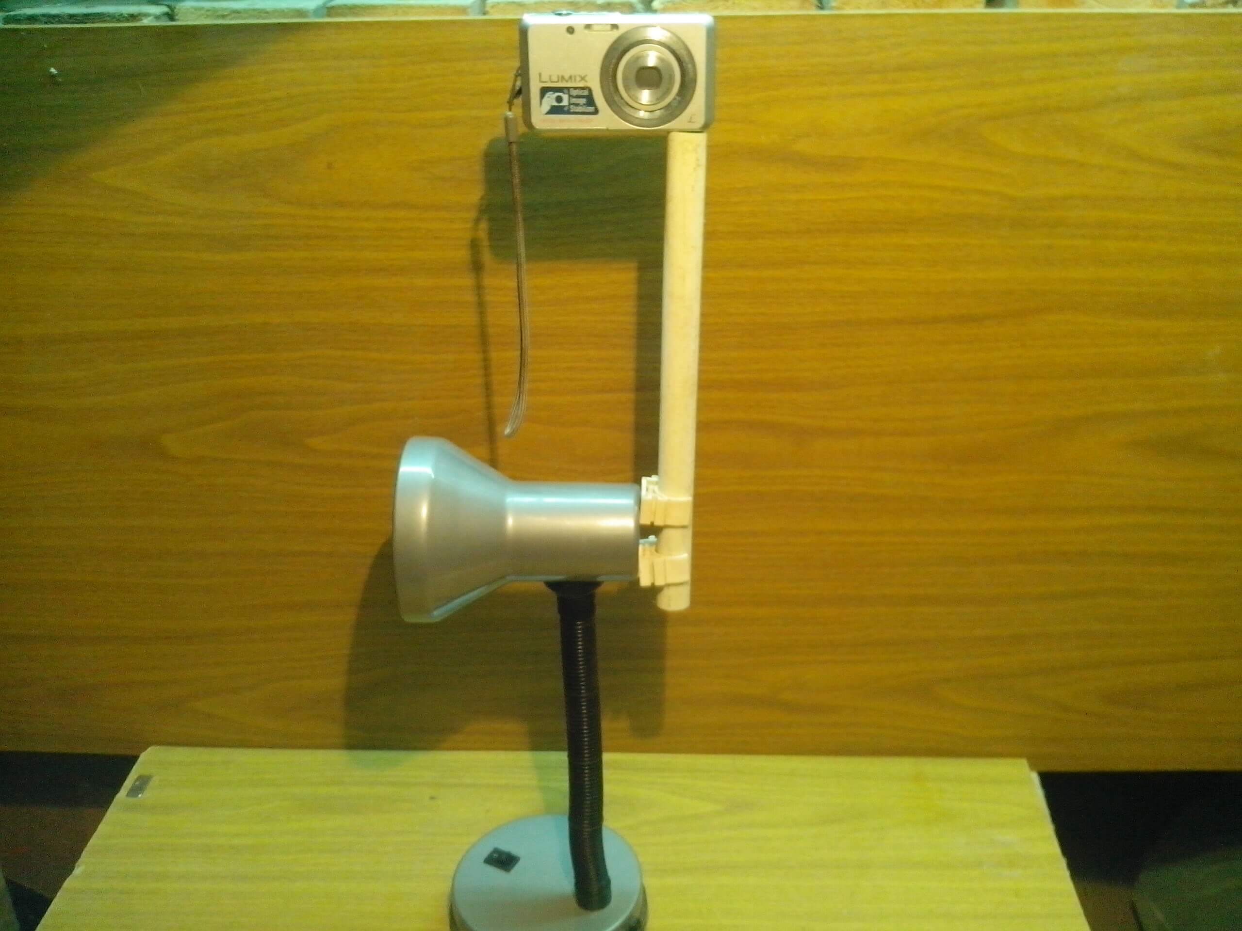 Вот такой простой штатив для камеры можно изготовить из куска полипропиленовой трубы пару клипс ,болта м6 и настольной лампы .