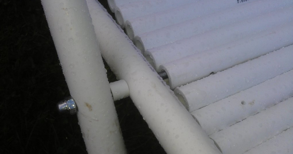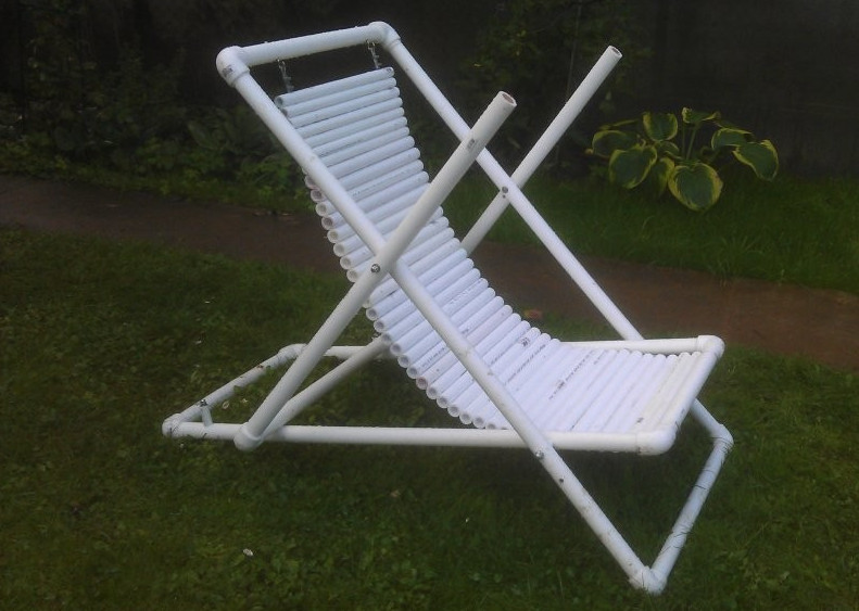 Шезлонг из пластиковых труб сделай сам.Предупреждаю — вначале посчитайте и размеры, и деньги. Ноги не должны передавливаться, с сиденья скатываешься, если короткое. Лучше сделать вначале его, прикрепить к чему либо, замерить под себя. И уже отталкиваясь от этого делать каркас. Я сделал наоборот — по мучался потом с побором наклона и длиной. По поводу денег — из дерева ДЕШЕВЛЕ! (Для сравнения спинка/сидушка — 22 метра 32й трубы — 22 х 55 = 1210)