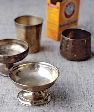 Для чистки серебра используйте обычную соду. Помойте серебряную вещь, поместите на лист алюминиевой фольги на дно кастрюли. Затем добавьте раствор соды (¼ чашки соды, несколько чайных ложек соли и литр кипящей воды). Оставьте на несколько минут. В результате химической реакции вся темнота с поверхности исчезнет.
